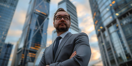 Confident businessman in a sharp suit and glasses standing with arms crossed, exuding professionalism and determination.