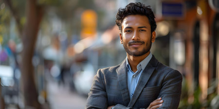 Confident young Indian businessman posing outdoors in urban setting arms crossed looking at camera. Concept Outdoor Photoshoot, Urban Setting, Confident Businessman, Indian, Poses