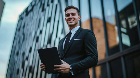 Businessman with laptop smiles in front of modern architectural building
