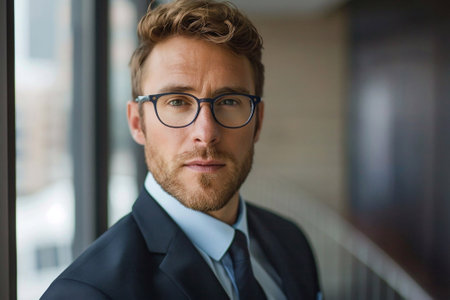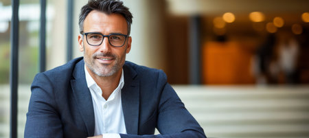 A 35-year-old businessman wearing glasses and a stylish suit in an office setting. Radiating confidence and competence, he gazes directly at the camera, embodying leadership and success.