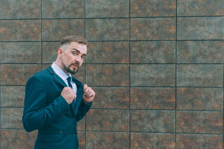 businesspeople. confidence businessman in suit. a successful manager in a jacket on the background of an office building