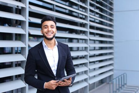 Young handsome businessman Arab Muslims is in the business center in black elegant dress on building background. Businessman man male looking waiting concept and smiling.