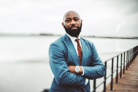 A true tilt-shift portrait of a successful adult African bald bearded man in a blue suit with tie and watch standing with hands crossed on an embankment near facing on an overcast day, selective focus