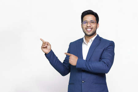 Portrait of a happy businessman pointing finger away over white background.