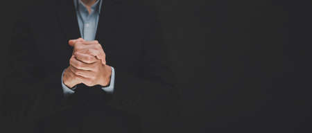 businessman hand praying and worship to GOD Using hands to pray in religious beliefs and worship christian in the church or in general locations in vintage black tone or copy space.