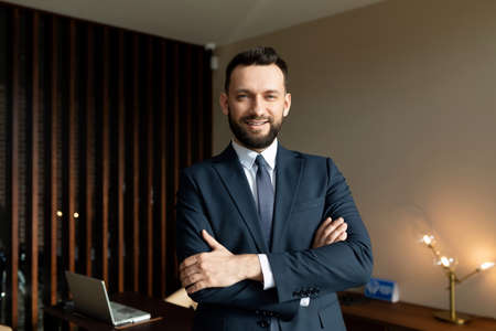 Portrait of a smiling businessman with crossed arms standing in the office