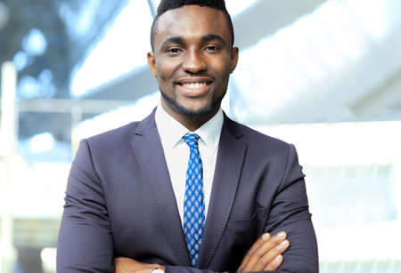 Portrait of confident african american businessman standing with crossed arms in modern office