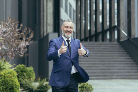 Successful senior gray haired businessman boss, outside office building smiling and looking at camera, experienced investor showing middle finger up, man in business suit