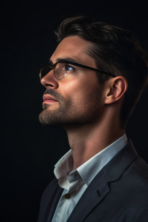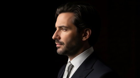 stylish man in formalwear with stubble and beautiful hair, side-view photo