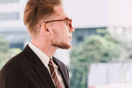 Portrait of businessman looking aside. Businessman in suit. Serious grizzled businessman