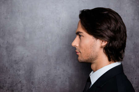 Profile portrait of a handsome man wearing elegant suit. Men's beauty, fashion. Businessman.