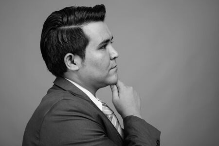Profile portrait of happy business professional man smiling grey background copy space, businessman
