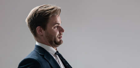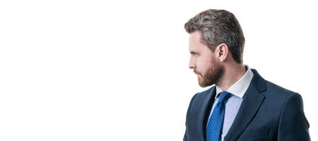 Man face portrait, banner with copy space. Business man in suit, isolated studio background, banner poster. Professional man profile portrait in business formawear isolated on white, manager.
