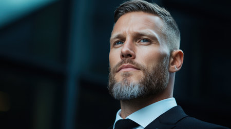 A confident man with a well-groomed beard stands in front of a modern building, showcasing determination and ambition in a professional setting.
