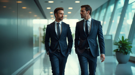 Two businessmen are having a conversation while walking through a modern office