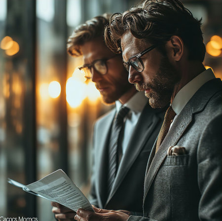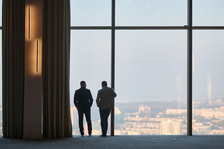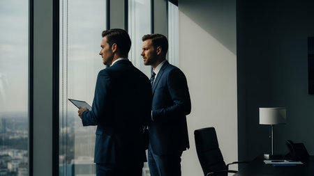 Professional businessmen in dark suits stand by a large office window, one holding a digital tablet, observing the city skyline They appear focused and engaged in strategic thought