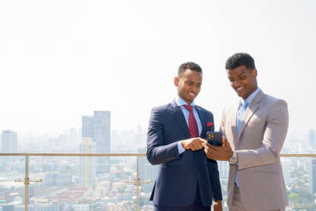 Portrait of two African businessman smiling and using mobile phone at rooftop against city view