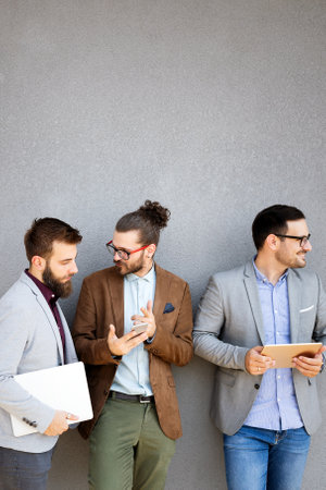Generative AI : Group of three modern business men of different age and ethnicity looking seriously at camera Business life style concept with businessmen standing outside