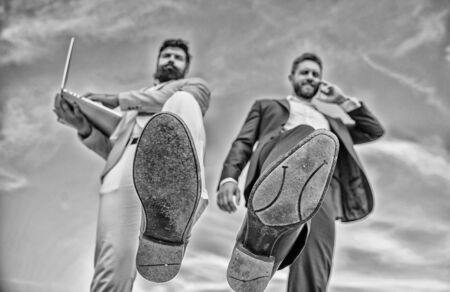 Businessmen making step bottom view. Business technologies coming. Big step for entrepreneurship. Smashing competitiveness. Business partner busy with phone call moving forward, foot shoe close up
