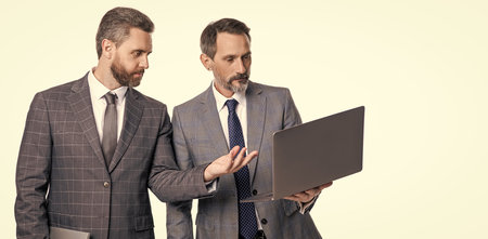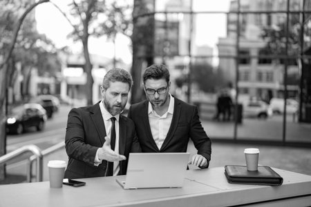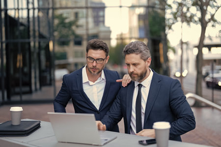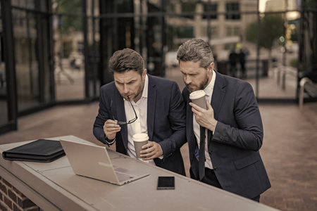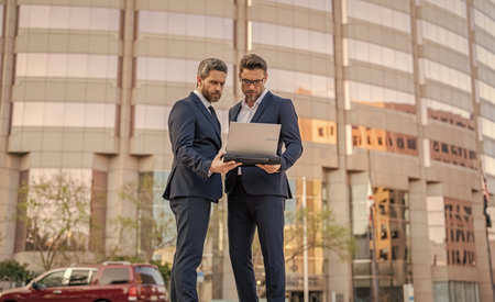 Businessmen in suit with laptop. Online working. Businessmen checking email. Business men freelancing outdoor. Business online. Men working on laptop. Businessmen working online. Freelance concept