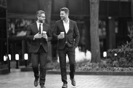 Colleague and friends. Two successful business men walking outdoor. Businessmen go to work. Business talking. Two businessmen in elegant business suit. Walking colleague