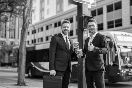 Businesspeople outdoor. Business colleague at coffee break. Businesspeople talking with coffee cup. Colleague have business meeting. Business of businesspeople. Coffee break. Business advertisement