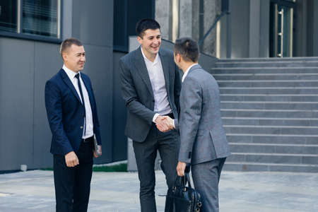 Group of Happy Men Corporate Workers Greeting Each Other Shaking Hands Starting Their Working Day in Contemporary Business District.