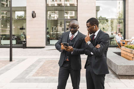 Meeting of two partners black african american businessman in suits and glasses outdoors