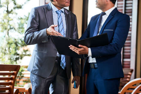 Mature business colleagues holding folder with business project and talking about it while standing in cafe