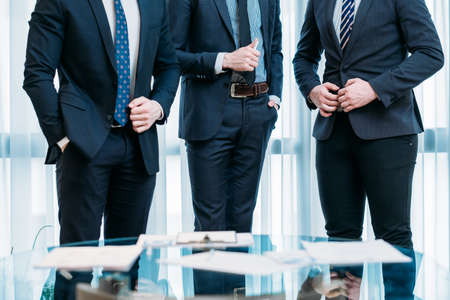 leadership and success concept. team of business men. confident corporate top managers standing in office. stylish bankers in formal clothing in company workspace.