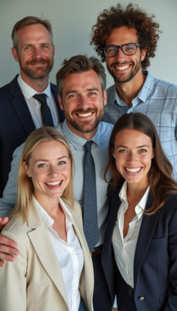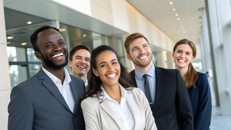 A diverse group of five professionals, smiling brightly, showcases teamwork and camaraderie in a modern office setting. Their confident expressions and stylish attire reflect a positive work environment, emphasizing collaboration and success.