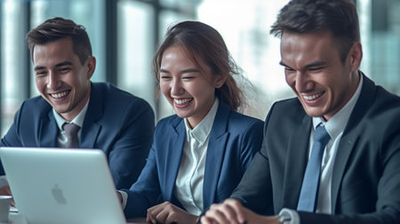 Group of cheerful professionals laughing together in modern office setting, showcasing camaraderie and teamwork. Their joyful expressions reflect positive work environment