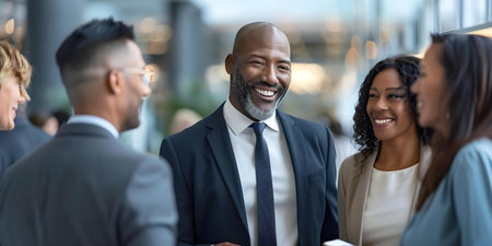 A diverse group of professionals enjoys a networking moment, smiling and engaging in conversation in a sleek office.