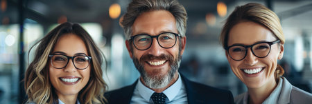 A lively scene featuring three smiling business professionals in a modern office. Their joyful expressions highlight camaraderie and teamwork in a dynamic work environment.