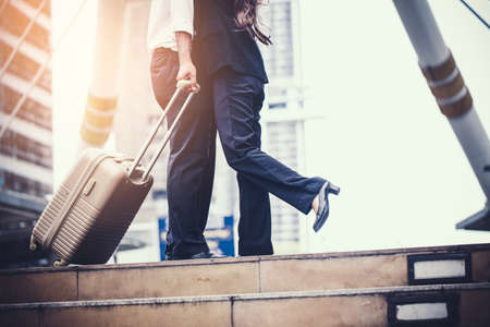 Businessman and businesswoman dragging a suitcase. And walking through the corridor during rush hour in the city.