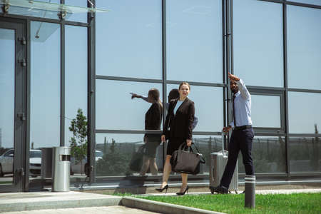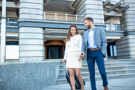 Presentation. Meeting of young business partners after arriving to end point of business trip. Man and woman walking against glass wall background of modern building. Concept of business, finance, ad.