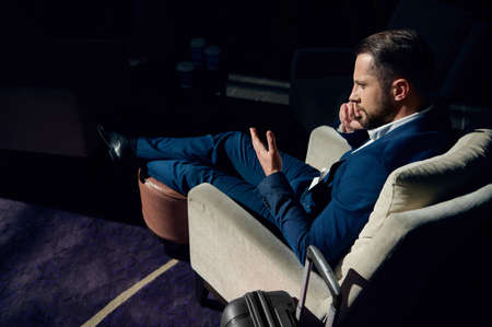 Overhead view of a successful young businessman in business casual suit talking on mobile phone while sitting on an armchair. Portrait of a handsome entrepreneur, investment advisor, freelancer