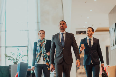 Photo of a business team in suits walking in a modern corporation. Successful business team. Selective focus