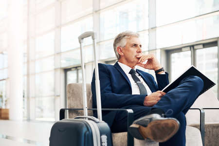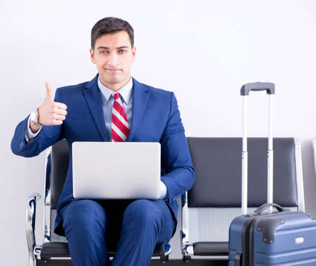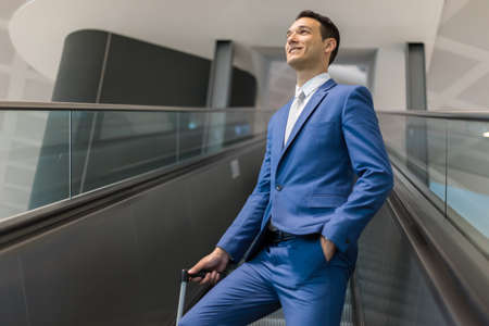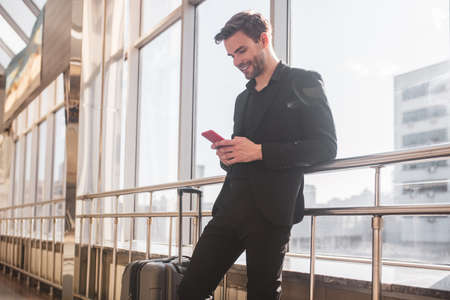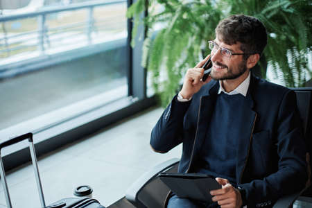 Happy business man waiting for his fligh in airport.