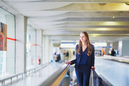 Young elegant woman with hand luggage on travelator on international airport terminal. Cabin crew member with suitcase. Travel or business trip concept