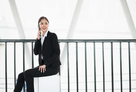 Young asian business woman walking in airport terminal with trolley bag. Beautiful female travel in city downtown.