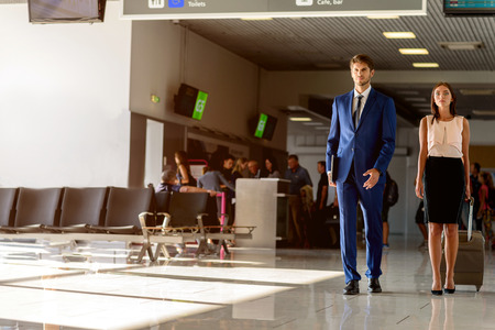 Confident young businesspeople are ready for official journey. They are walking in airport. Woman is carrying suitcase