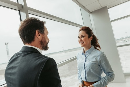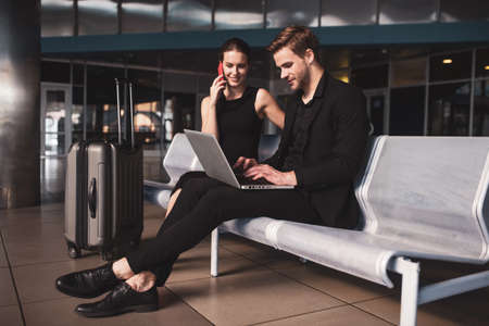 Business couple standing together with baggage and checking time near the window at the departure area at the airport