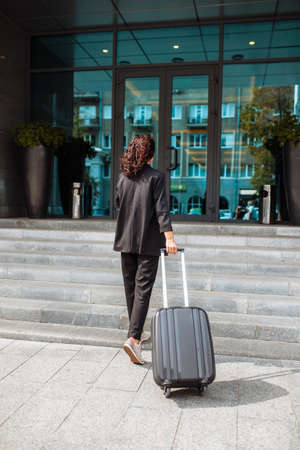 Young business woman walking up the staircase with a suit ready to check in at hotels reception. Beginning of a business trip for a professional worker. Work and travel concept.