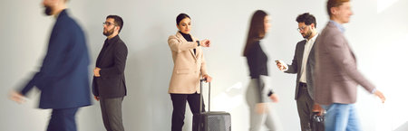 Motion blurred business people walking near business woman who is looking at her wristwatch in hurry to catch flight. Woman with suitcase checks time while standing against gray wall. Web banner.