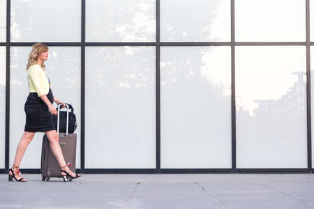 Happy smiling young businesswoman in a suit pulling a suitcase in front of an airport window.