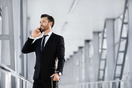 Successful businessman standign in airport, having phone conversation