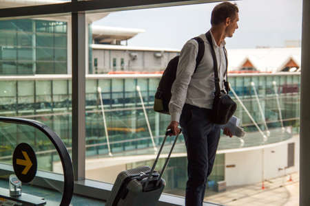 Business trip concept. Cropped of businessman standing by window in airport, holding luggage, copy space. Unrecognizable entrepreneur in black suit waiting for flight in modern airport, sun glare