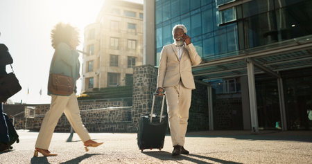 Business man, phone call and suitcase in city, street or conversation for booking, travel or transportation. Senior corporate executive, smartphone or luggage on talk, chat or sidewalk in Cape Town
