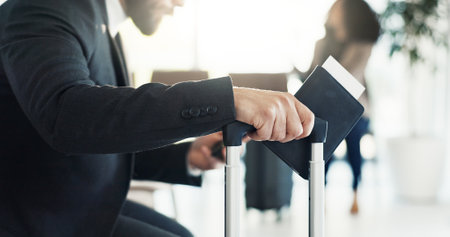 Travel, businessman and hand in airport with passport, luggage and waiting in boarding lounge. Person, suitcase and sitting in terminal for delayed flight, opportunity abroad and international work